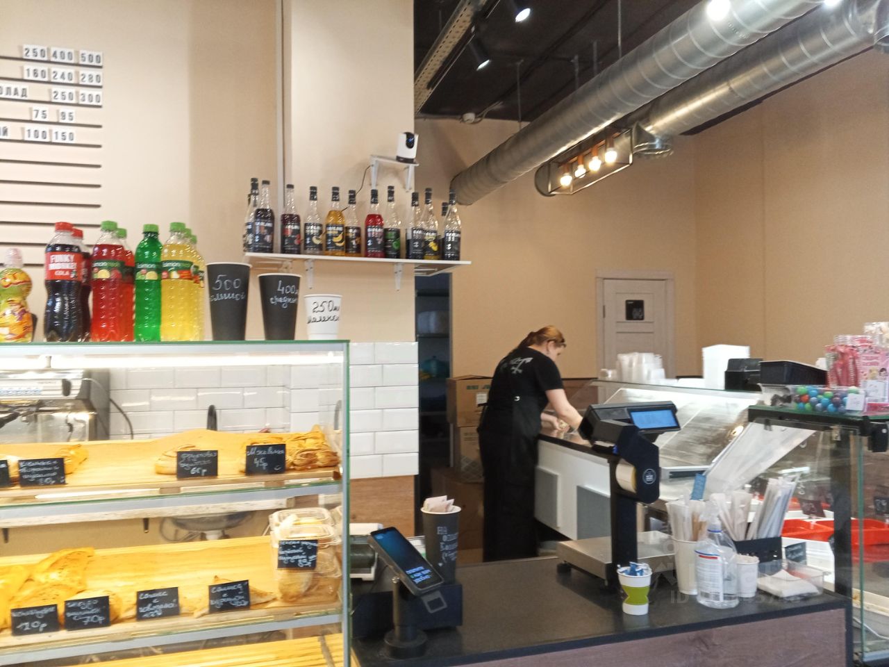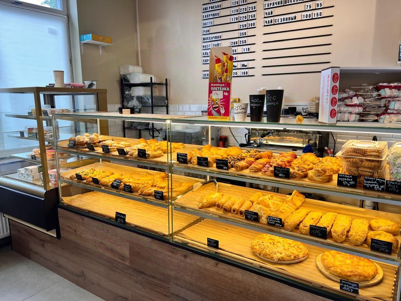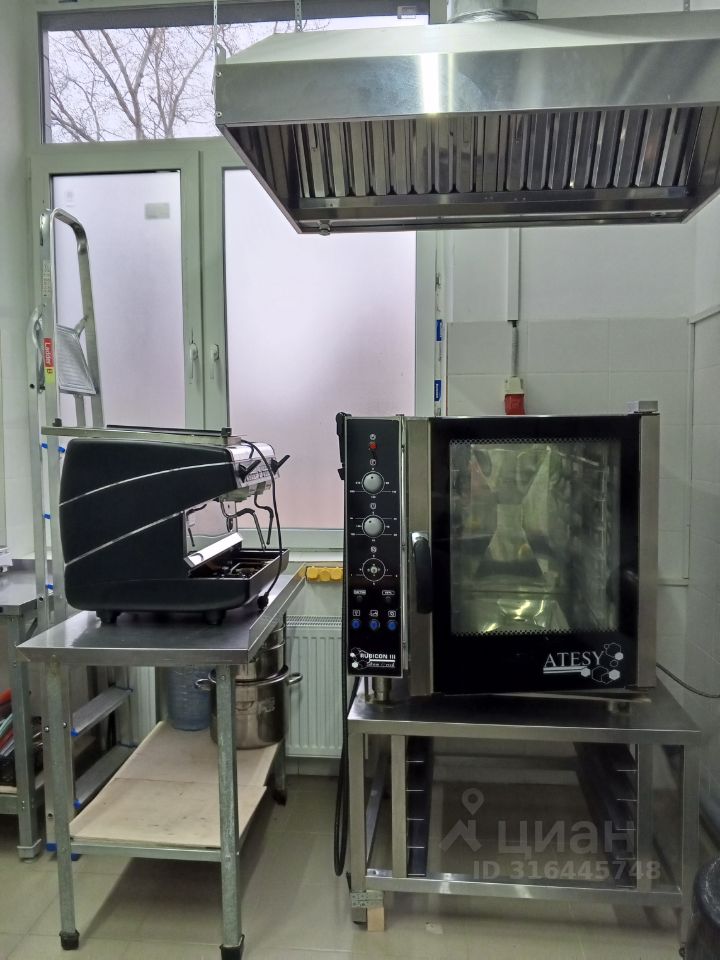 *Оборудование (все новое, профессиональное)*: - *Кухня*: пароконвектомат (10 уровней), тестомес, плита, холодильники, морозильный ларь, стеллажи. - *Зал*: витрины для выпечки и кулинарии, кофемашина Simоnеlli, мебель, посуда. - *Инфраструктура*: приточно-вытяжная система (800 тыс. руб.), пожарная сигнализация, видеонаблюдение, вывеска (согласована на 5 лет).