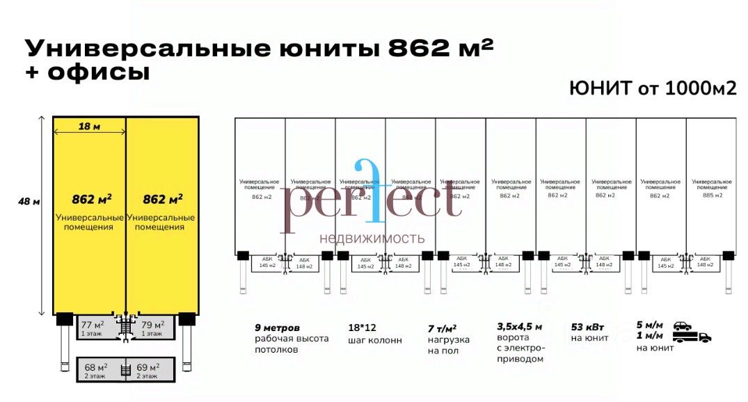- Каждый юнит имеет отдельный вход, высокие потолки для оборудования и подъемные ворота. Несколько юнитов можно объединить в единое. Рядом с производством офисные помещения. пространство и увеличить площадь.